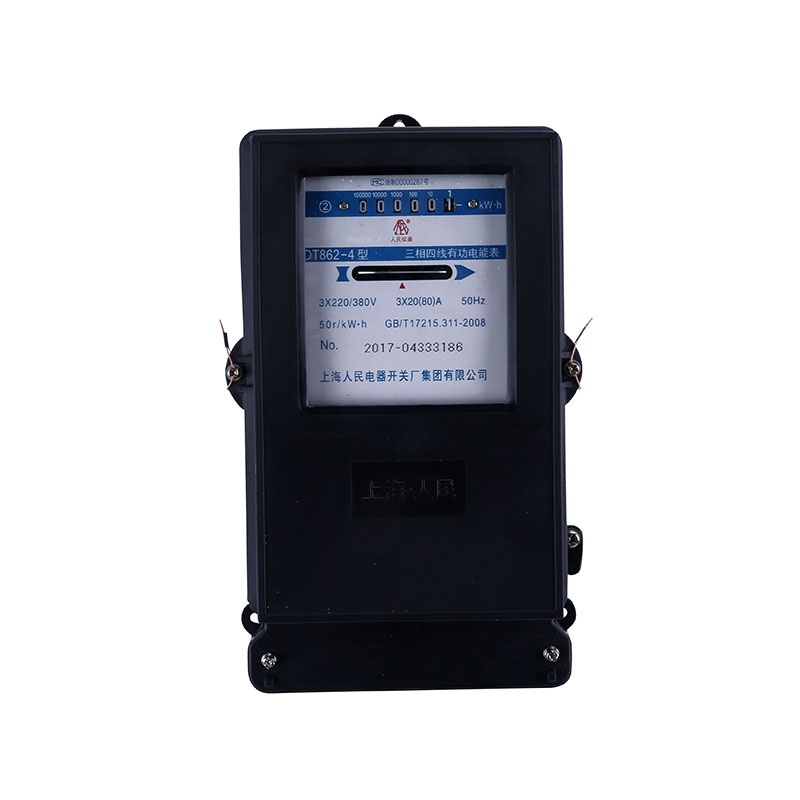 DT862型三相四线、DS862型三相三线交流有功定能表系机械式感应系仪表,该系列为全国统一设计产品,用于计量电网中的三相四线、三相三线交流有功电能,其技术指标完全符合GB/T17215.311-2008交流有功电能表国家标准及IEC521-1998国际标准。产品由三组电磁元件双圆盘、阻尼磁钢、铝合金基架、五位或六位字轮计度器,接线盒及外売组成,电磁元件采用分离式结构,分别置于基架两侧,为提高电能表稳定性,电压铁芯采用封闭插入式,阻尼元件采用铝镍钻磁钢,并有热磁合金作温度补偿,转动系统经过平衡校准,其轴承是带h有防震弹簧的双宝石结构以延长电能表的使用寿命