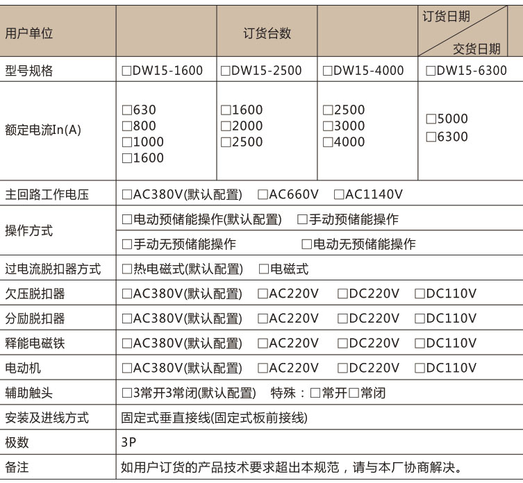 规型号有:DW15-630,DW15-1600,DW15-2500,DW15-4000