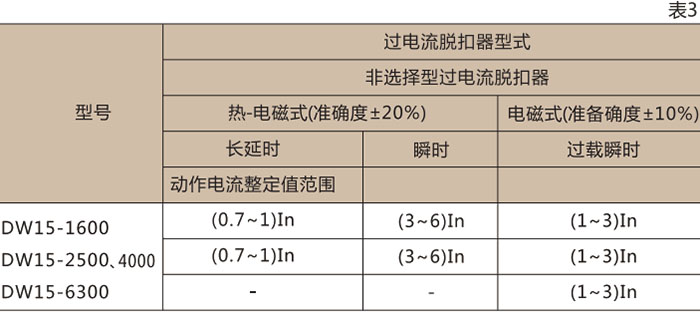 过电流脱扣器动作电流整定值调节范围见表3