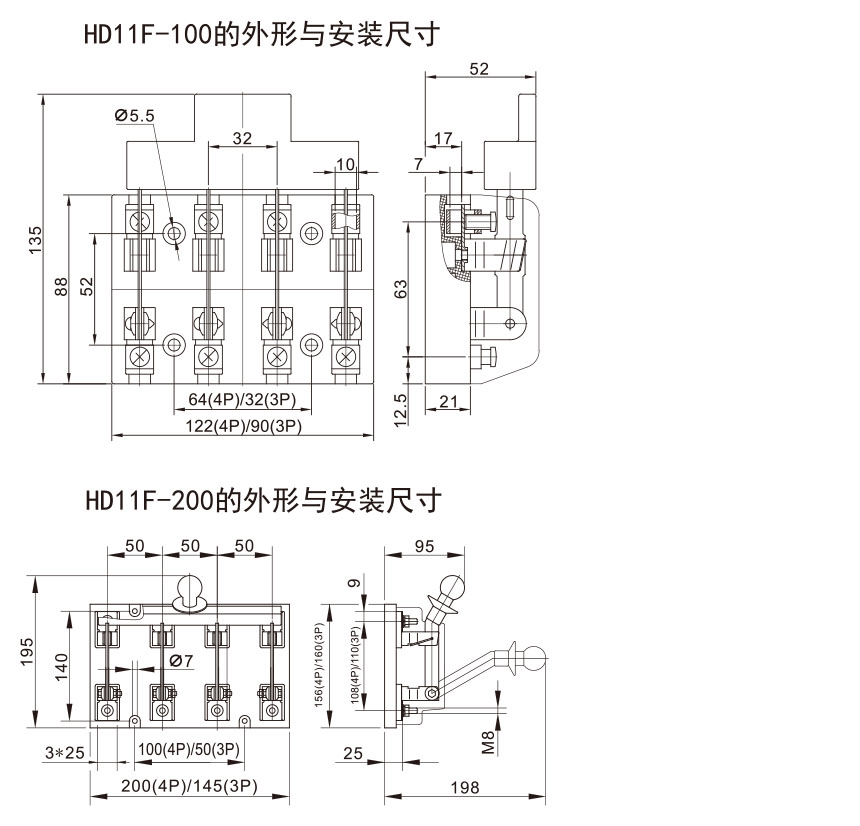 HD11F-100、200刀开关(光伏款),适用于交流50Hz、额定电压交流AC400V、直流DC500V(3P)/DC750V(4P)、约定发热电流至200A的成套配电装置中。 开关采取中央手柄式操作,主要作为电气隔离之用,不切断带有电流的电路,可广泛用于光伏项目。 开关结构简单、操作方便,符合GB/T14048.3标准要求。