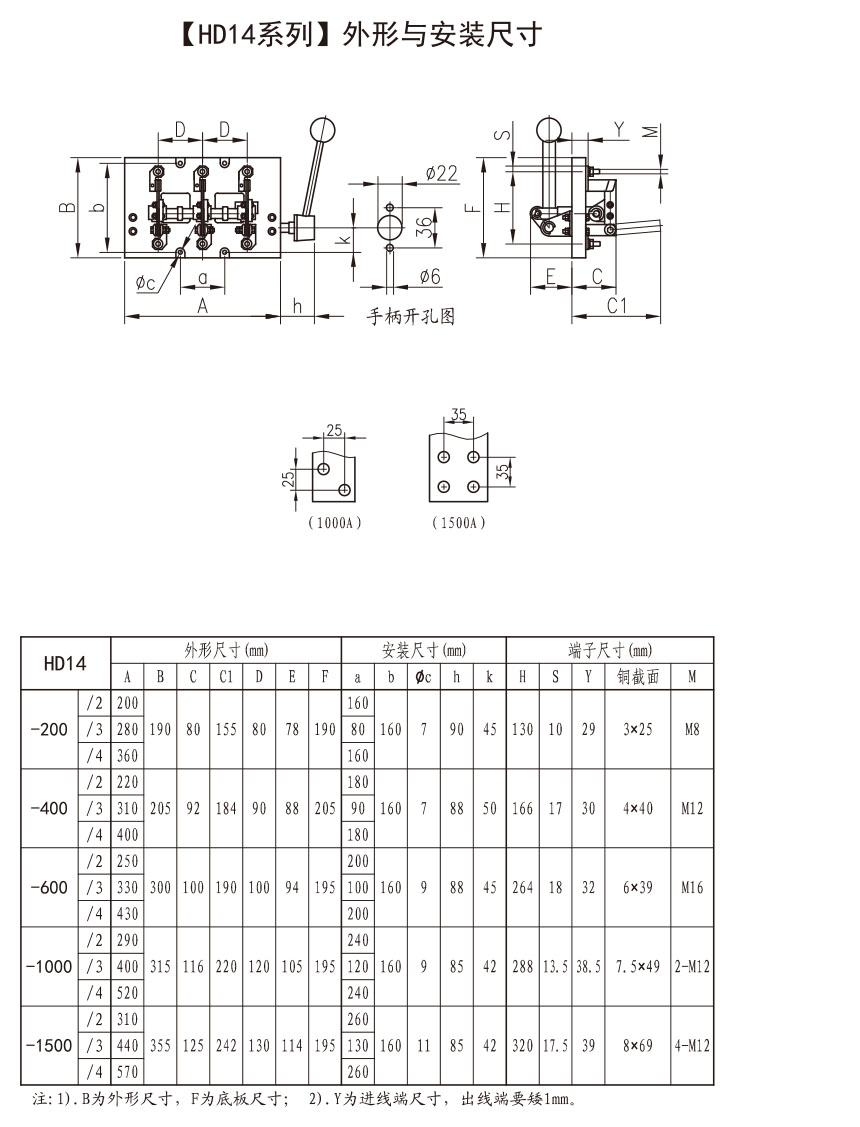 HD14、HS14系列侧面操作手柄式刀开关主要用于动力箱中。