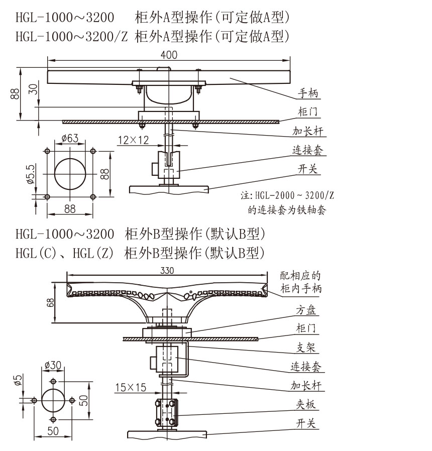 ● 侧面操作、柜外操作、柜外操作、板后接线、直接观察触头窗口等隔离开关的主要参数全部与HGL相对应。