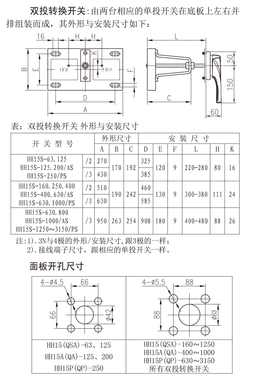 HH15(QA)系列隔离开关熔断器组,HH15A(QA)、HH15P(QP)系列隔离开关,HH15S(QSS)、HH15S(QAS)、HH15S(QPS)系列双投转换开关(以下简称开关),适用于交流50Hz、额定电压400V、约定发热电流至3150A的具有高短路电流的配电电路和电动机电路中,用作手动不频繁操作的主开关或总开关,其中QSA、QSS系列开关可作电路短路保护之用。