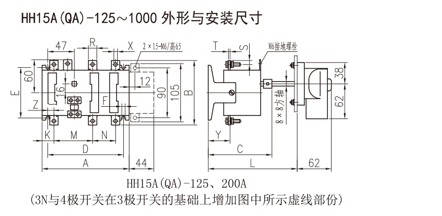 ● HH15A(QA)隔离开关的触头系统由双联触头串联而组成,HH15P(QP)隔离开关的触头系统由双联触头井联而组成,双投转换开关由两台相应的单投开关左右并排而组成。