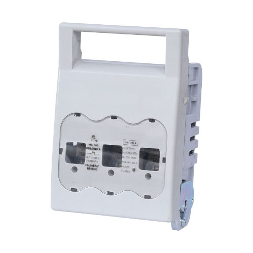 开关主要由树脂底座与上盖两大部份组成,三对夹型触头与灭弧室直接装在底座上,熔断体装在上盖中直接作为动触头刀片用,上盖可沿铰销旋转成扇形打开使熔断体从插座中完全拔出,上盖亦可方便地从底座上撤出,便于开关的安装与安全拆换熔断体。