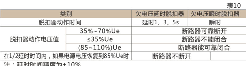 ● 断路器的欠电压脱扣器性能见表10