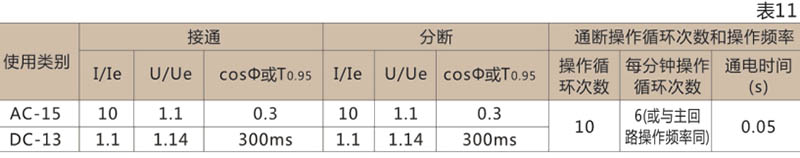 ● 辅助触头的非正常接通与分断能力:辅助触头非正常使用条件下的接通分断能力按表11