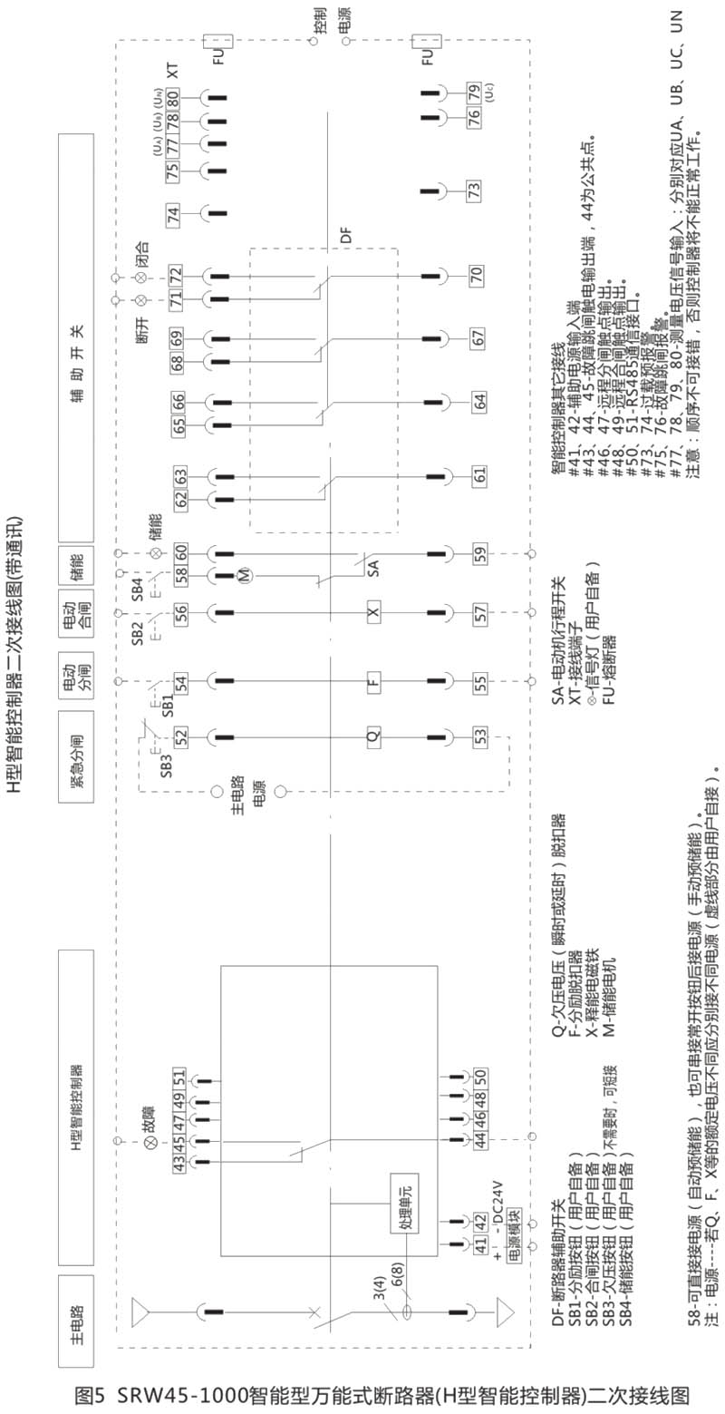 断路器共有40个接线端子,接线图见图5,、图6、图7、图8所示。