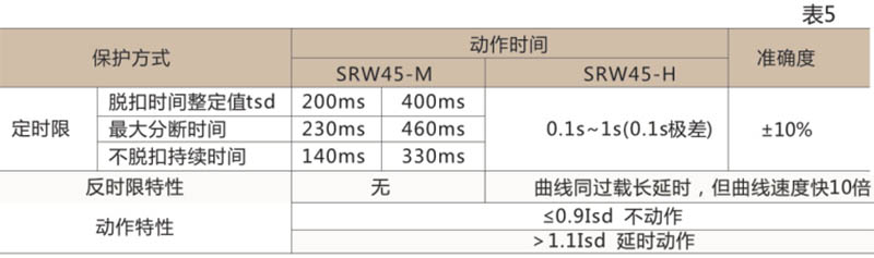 I²TS(8IR)²(式中TS)为短延时整定时间,tsd为短延时动作时间,当过载电流>8IR,自动转换为定时限特性,其动作特性见表5。