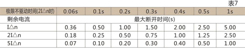 ● 剩余漏电流保护是通过外接外部漏电互感器来实现剩余漏电流讯号检测动作特性为延时型。其延时特性符合表7(表中不包括控制器固有动作时间20ms)