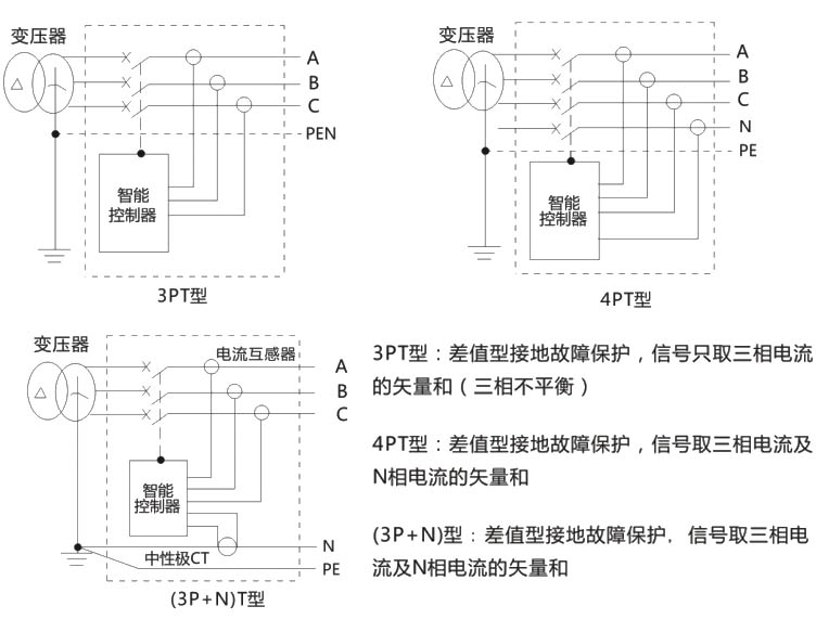接地保护是控制器根据三相电流和中性电流矢量和进行保护,根据断路器极数分为3PT、4PT(3P+N)T三种保护方式(见图3)