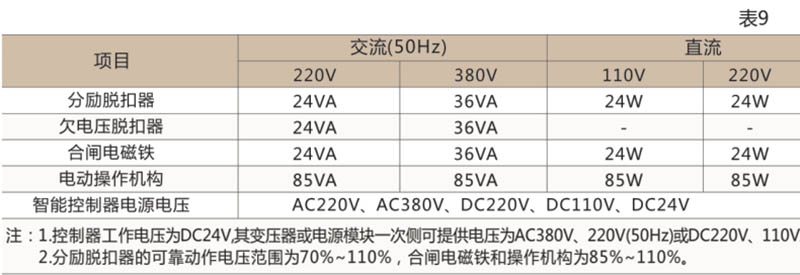 ● 断路器的分励脱扣、欠电压脱扣器、电机操作机构、释能(合闸)电磁铁、智能控制器的工作电压及所需功耗见表9